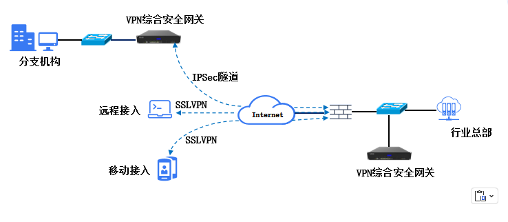 VPN综合安全网关产品部署方式灵活,提供安全、快速、易用的移动办公远程接入方案,实现分支机构、合作伙伴、客户和外地出差人员随时随地使用终端安全、便捷地接入访问内部资源。可以根据客户现有网络架构进行灵活部署,尽量减少了客户现有网络的变动,保证了整个网络的安全性及稳定性。