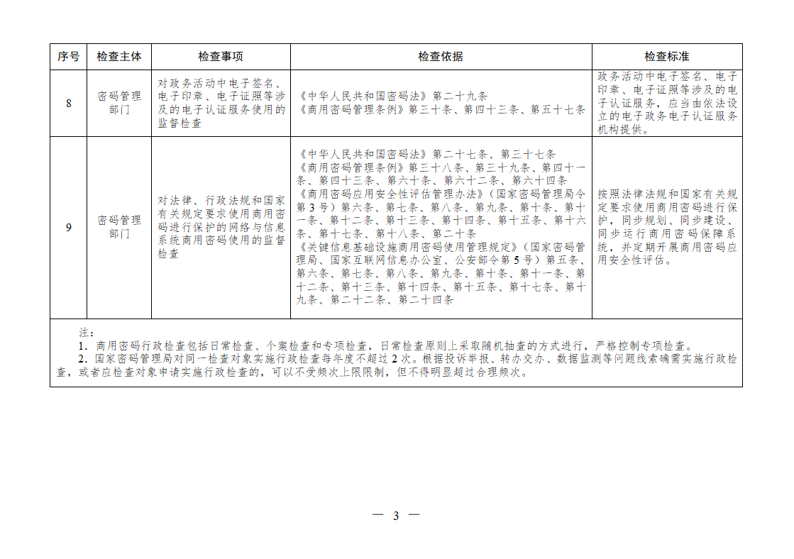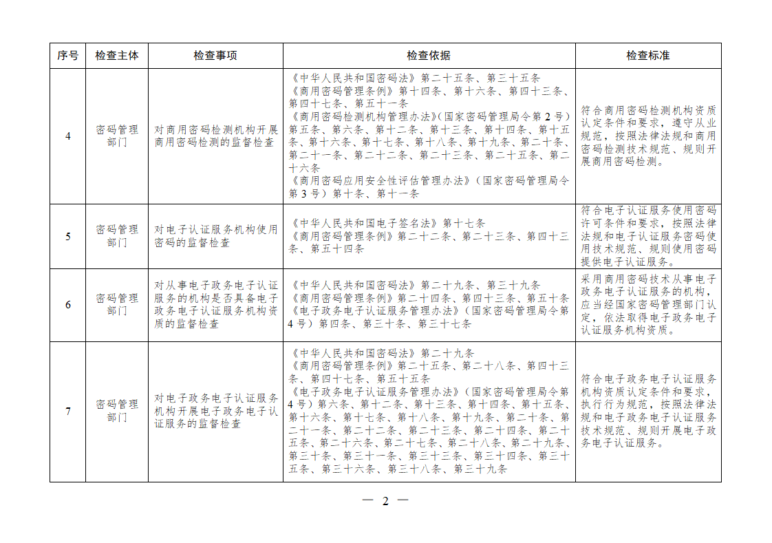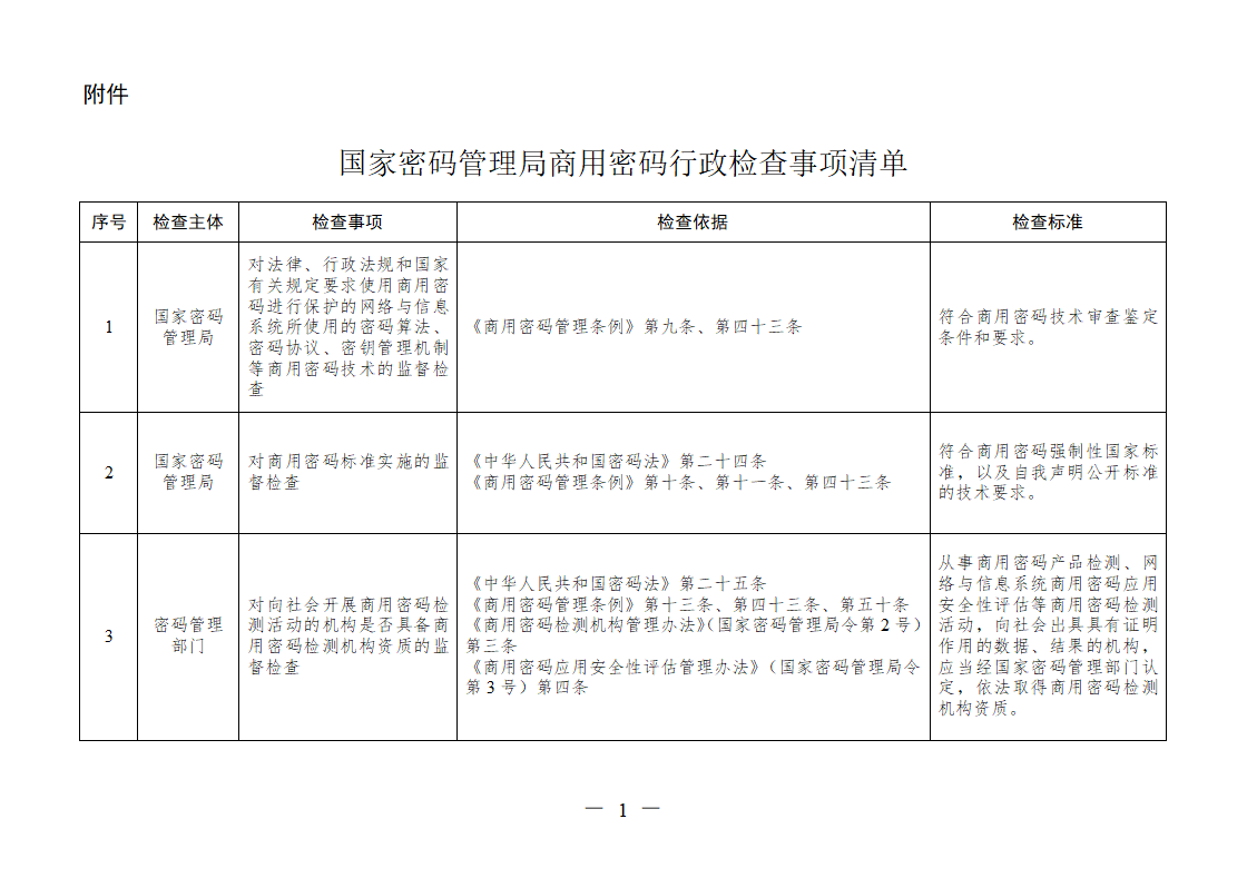 根据《中华人民共和国密码法》、《商用密码管理条例》及相关商用密码管理规章,现发布《国家密码管理局商用密码行政检查事项清单》,自发布之日起施行,2024年7月19日发布的《国家密码管理局关于发布〈国家密码管理局商用密码随机抽查事项清单(2024年版)〉的公告》(国家密码管理局公告第47号)同时废止。