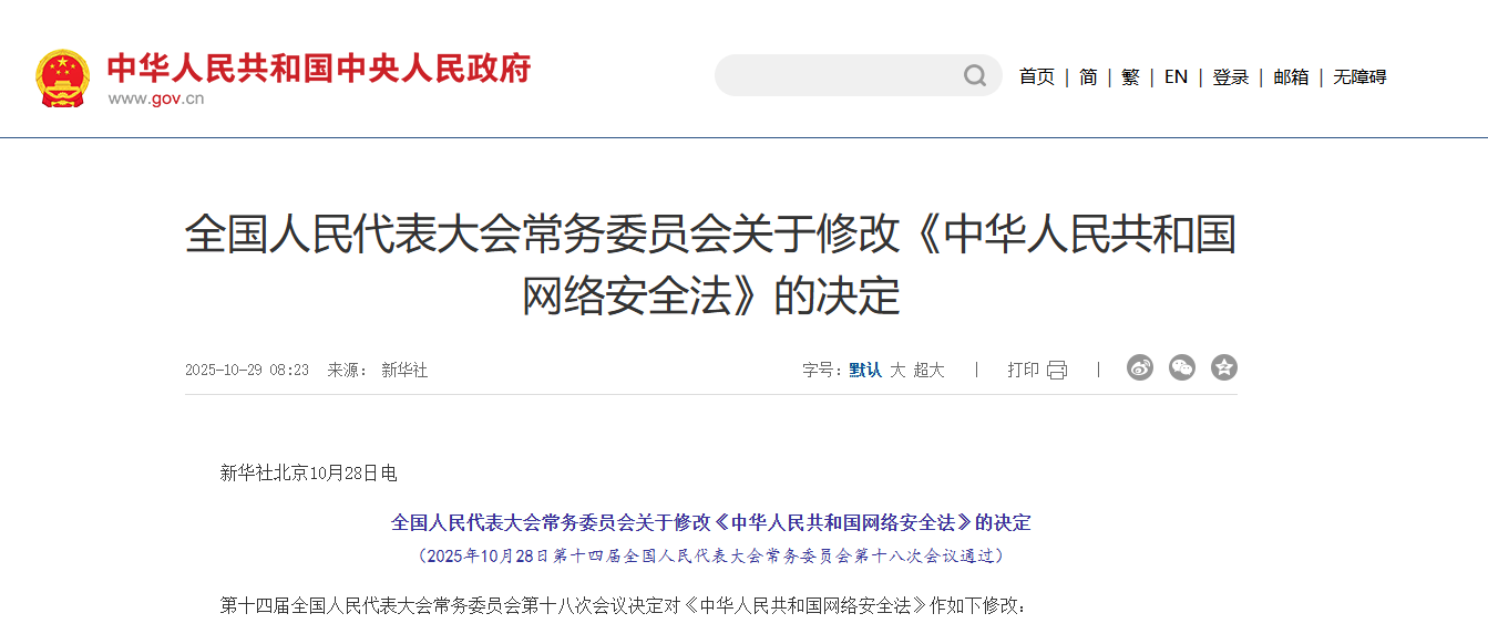《中华人民共和国网络安全法》根据本决定作相应修改并对条文顺序作相应调整,重新公布。
