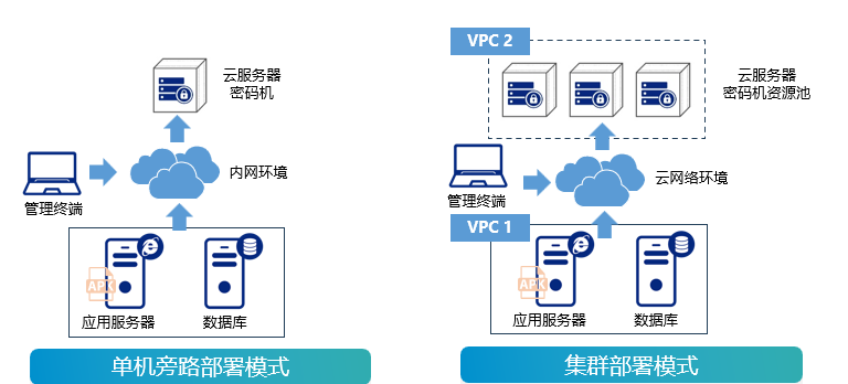 ①单机旁路部署:云密码机设备旁路部署于核心交换机,应用系统通过SDK调用后端密码机的能力。