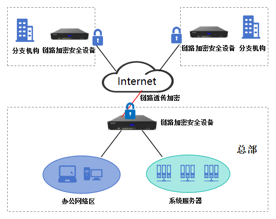 解决方案:为各机构访问的数据系统在的网络与通信安全层面供符合密码测评要求及等保2.0三级要求的安全网关产品,采用链路透传加密网关隧道透明无感知加密、支持国密SM1/SM2/SM3/SM4算法,通过在各节点边界处部署链路透传加密网关,用户各节点在使用会议系统、OA系统、电子政务等系统时进行无感知加密,帮助用户实现多支点网络的安全、高速互联,可以最大限度保障业务互联的数据的机密性、完整性。